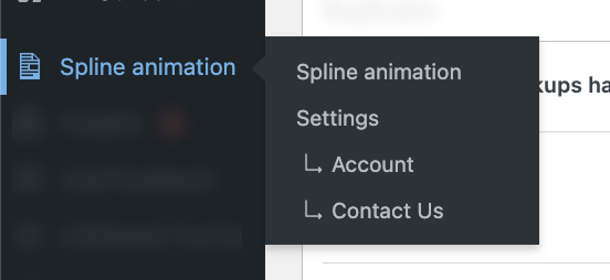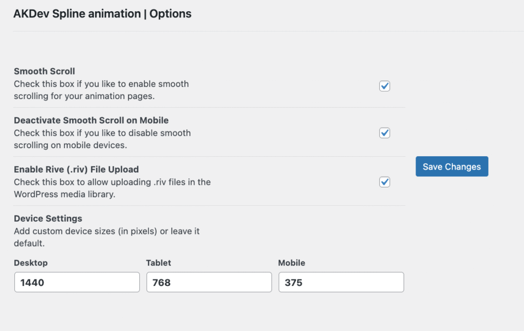 page, which you can visit by clicking settings link in Spline animation of your wordpress dasboard sidebar below is a screenshot of all the available options and the description of that option.