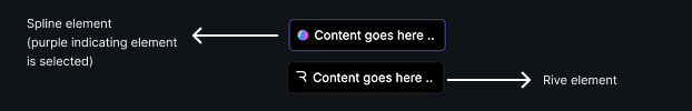 Now to add animation to your spline or rive element you will click on either element from the right side bar, which will enable that item with purple border indicating that item is selected so you can now add animations to it.